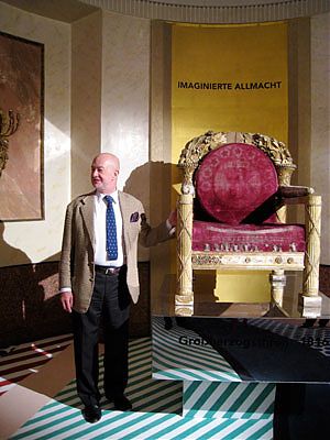 Herbert Lachmayer verantwortete vor zwei Jahren die in ihrer facettenreichen Ausführlichkeit und Sinnlichkeit imponierende Wiener Mozart-Ausstellung und führt uns persönlich durch sein neues Gesamtkunstwerk: Historische Dokumente, Höfische Devotionalien, Büsten und Biographien vor einer extra für die Ausstellung erdachten bunten Tapete von Franz West mit den Bildnissen der Weimarer Fürsten und der in Weimar gehaltenen und archivierten Kulturgrößen. Der von Roy Lichtenstein gestaltete Teppichboden ist nicht ohne Ironie der Ausstellung in den klassizistischen Schlossräumen unterlegt.