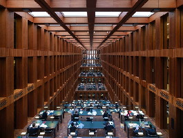 Max Dudler und sein Projektleiter Jochen Soydan erläutern die vertikale Lösung auf dem schmalen Grundstück, die abgestuften Etagen führen zu unterschiedlich großen Arbeitsräumen mit viel Tageslicht. Das Paradies der Bücher ist ein Ort des ästhetischen genussvollen Verweilens, kein Bücher-Magazin. Das Gebäude gehört zu den besten Kulturbauten der vergangenen Jahre in Berlin.